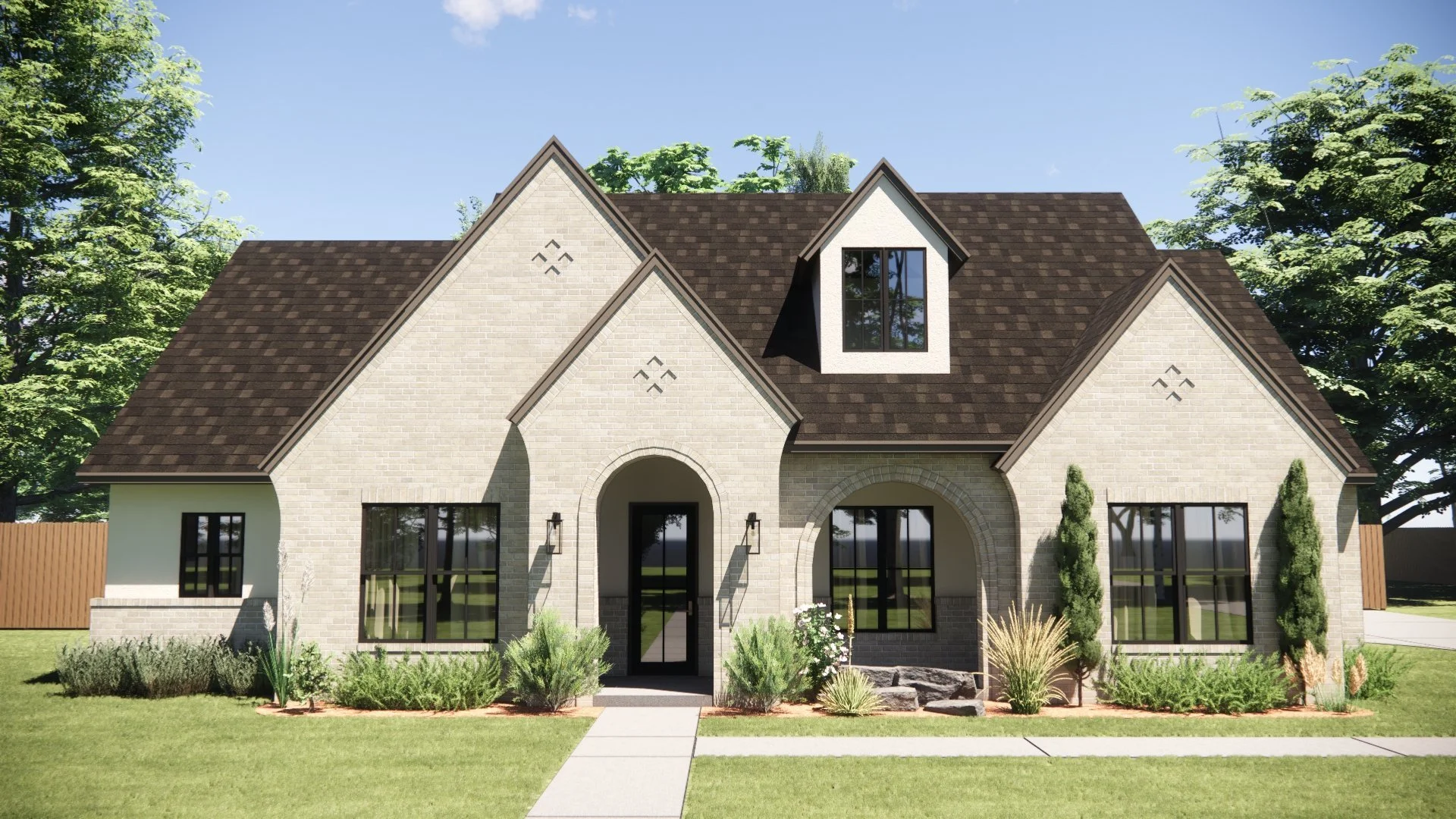 This charming modern Tudor offers a unique t-shaped porch design that provides this home with balance and unique design. The porch column is placed in the center of the front porch, providing privacy for homeowners living in high-traffic areas.